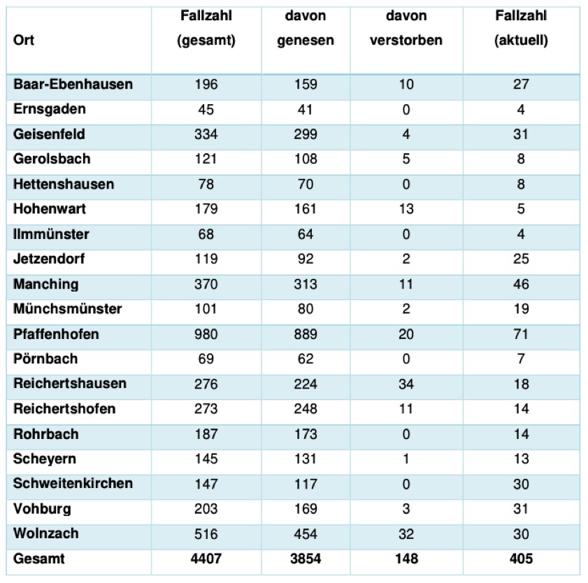 Von den bislang insgesamt 4407 Menschen aus dem Kreis Pfaffenhofen, bei denen nach jüngstem offiziellen Stand eine Corona-Infektion bestätigt worden ist, gelten laut aktueller Mitteilung der Behörde mittlerweile 3854 als genesen – das sind 54 mehr als gestern gemeldet. Die Zahl der Infizierten und noch nicht genesenen Corona-Patienten hat sich damit im Landkreis verringert und beträgt – Stand: heute Mittag – derzeit 405 (gestern: 419). Die infizierten Personen befinden sich in häuslicher Isolation.
