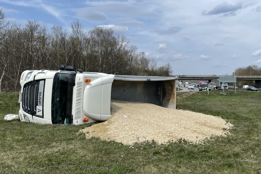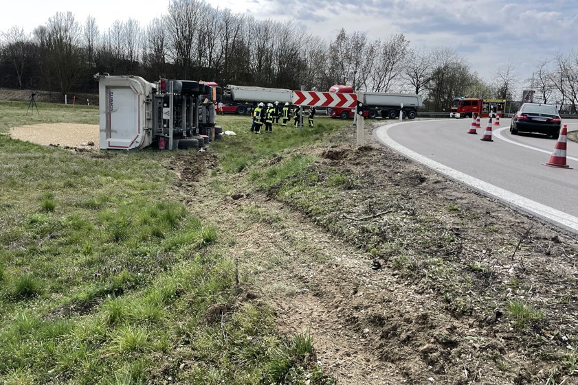 Der Sattelzug-Lenker habe leichte Verletzungen erlitten; er sei vorsorglich in ein Krankenhaus gebracht worden. Der geladene Kies hatte sich über die Grünfläche verteilt. Außerdem verlor der Sattelzug laut Mitteilung der Polizei ungefähr 200 Liter Öl. Die Halter-Firma habe den Lkw eigenständig bergen sowie den mit Öl belasteten Bereich entfernen können. Der Sachschaden wurde auf insgesamt 30 000 Euro geschätzt. Zu Verkehrs-Behinderungen sei es wegen des Unfalls nicht gekommen. Im Einsatz waren auch das Wasserwirtschaftsamt, die Autobahn-Meisterei und die Feuerwehr.