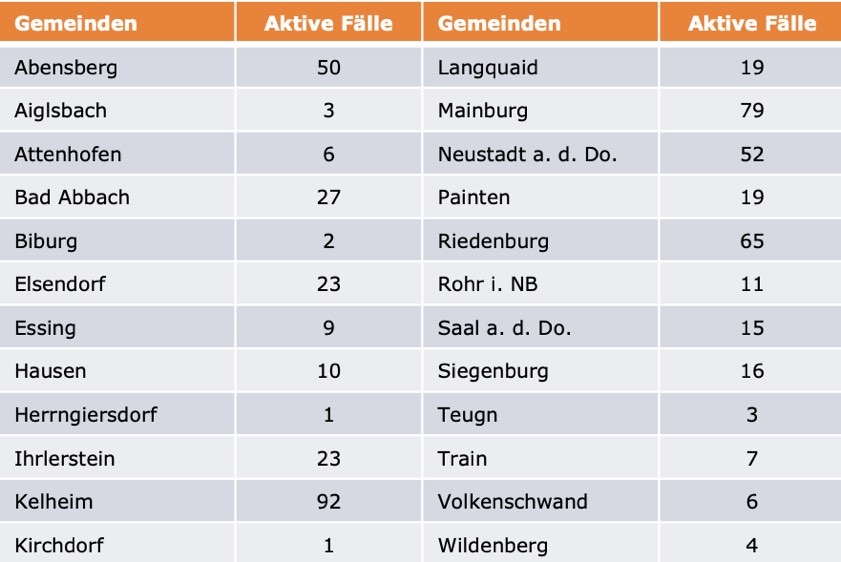 (ty) Im Kreis Kelheim gibt es in Zusammenhang mit der Corona-Pandemie, wie berichtet, mittlerweile 87 Menschenleben zu beklagen. Unter Verweis auf Daten des Gesundheitsamts teilte das Landratsamt heute mit, dass – Stand gestern, 16 Uhr – die Zahl der im Kreis Kelheim positiv auf den neuartigen Erreger getesteten Menschen bei insgesamt 4296 liegt – das sind 31 mehr als gestern gemeldet. Insgesamt 3666 hiesige Corona-Patienten (gestern: 3601) gelten mittlerweile als genesen und sind aus der Quarantäne entlassen. Derzeit gebe es 543 aktive Corona-Fälle (gestern: 577) im Landkreis. Zahlen aus den einzelnen Gemeinden zeigt die Tabelle unten. Angesichts der hohen Inzidenz-Werte gelten seit 20. März wegen der Corona-Notbremse wieder die strengen Regeln wie vor dem 8. März – darunter eine nächtliche Ausgangssperre.