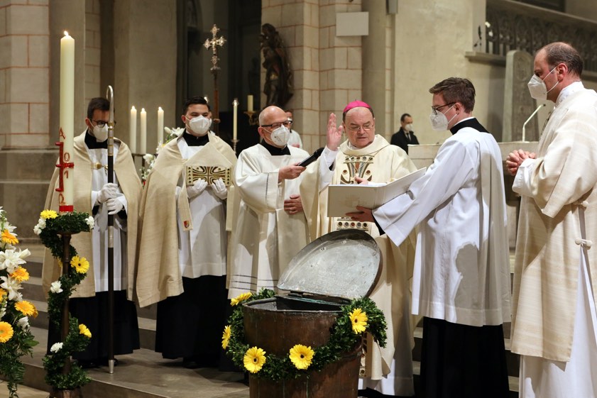 Auf der anderen Seite seien uns die Frauen mit ihren Ängsten aber auch wieder sehr nahe: "Lastet nicht auch auf uns die Sorge jenes schweren Steines, hinter dem alle Hoffnung begraben liegt?" Die Wundmale unseres Lebens seien auch die Wunden des Karfreitags, der Nacht der Welt und in unserem Herzen. So wie das Licht der Osterkerze für sich allein das Dunkel des Domes nicht ganz ausleuchten könne, gehe auch die Nacht weiter – "doch sie ist verklärt". In ihr leuchte die kleine Flamme von Ostern. "Und dieses kleine Licht hat mehr recht als die große Dunkelheit", betonte Meier.