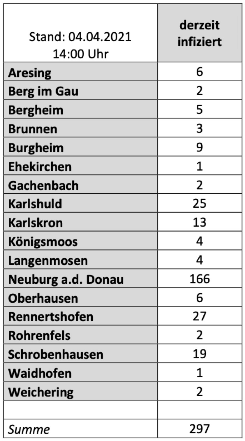 (ty) Im Kreis Neuburg-Schrobenhausen gibt es in Zusammenhang mit der Corona-Pandemie, wie berichtet, mittlerweile 65 Menschenleben zu beklagen. Die weitere Situation in dem Kreis stellt sich nach aktuellen Angaben des Landratsamts wie folgt dar: Bislang – Stand: heute, 14 Uhr – wurden 3269 Landkreis-Bürger positiv auf den neuartigen Erreger getestet. Die Zahl hat sich seit der gestrigen Meldung um 31 erhöht. Von den Infizierten gelten mittlerweile 2907 als genesen – 22 mehr als gestern. Momentan gibt es in dem Landkreis 297 aktive Corona-Fälle (gestern: 288). Aktuelle Zahlen aus den Gemeinden zeigt die Tabelle unten. Am 24. März lag die Sieben-Tages-Inzidenz zum dritten Mal in Folge über 100, deshalb gilt seit 26. März die so genannte Notbremse mit noch strengeren Regeln – untere anderem eine nächtliche Ausgangssperre (Das gilt ab 26. März im Kreis Neuburg-Schrobenhausen).