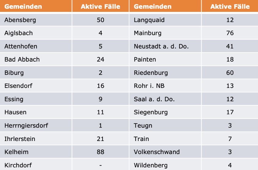 (ty) Im Kreis Kelheim gibt es in Zusammenhang mit der Corona-Pandemie, wie berichtet, mittlerweile 87 Menschenleben zu beklagen. Unter Verweis auf Daten des Gesundheitsamts teilte das Landratsamt heute mit, dass – Stand gestern, 16 Uhr – die Zahl der im Kreis Kelheim positiv auf den neuartigen Erreger getesteten Menschen bei insgesamt 4360 liegt – das sind 26 mehr als gestern gemeldet. Insgesamt 3776 hiesige Corona-Patienten (gestern: 3722) gelten mittlerweile als genesen und sind aus der Quarantäne entlassen. Derzeit gebe es 497 aktive Corona-Fälle (gestern: 525) im Landkreis. Zahlen aus den einzelnen Gemeinden zeigt die Tabelle unten. Angesichts der hohen Inzidenz-Werte gelten seit 20. März wegen der Corona-Notbremse wieder die strengen Regeln wie vor dem 8. März – darunter eine nächtliche Ausgangssperre.