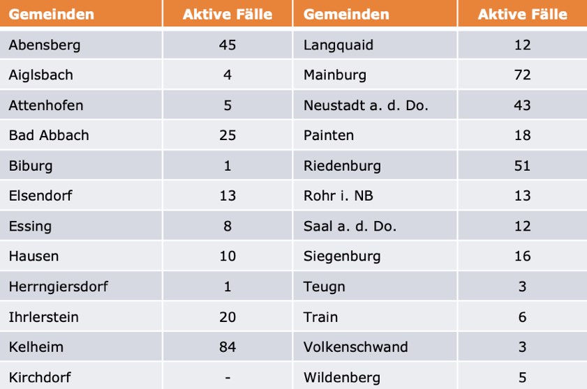 (ty) Im Kreis Kelheim gibt es in Zusammenhang mit der Corona-Pandemie, wie berichtet, mittlerweile 87 Menschenleben zu beklagen. Unter Verweis auf Daten des Gesundheitsamts teilte das Landratsamt heute mit, dass – Stand gestern, 16 Uhr – die Zahl der im Kreis Kelheim positiv auf den neuartigen Erreger getesteten Menschen bei insgesamt 4384 liegt – das sind 24 mehr als gestern gemeldet. Insgesamt 3827 hiesige Corona-Patienten (gestern: 3776) gelten mittlerweile als genesen und sind aus der Quarantäne entlassen. Derzeit gebe es 470 aktive Corona-Fälle (gestern: 497) im Landkreis. Zahlen aus den einzelnen Gemeinden zeigt die Tabelle unten. Angesichts der hohen Inzidenz-Werte gelten seit 20. März wegen der Corona-Notbremse wieder die strengen Regeln wie vor dem 8. März – darunter eine nächtliche Ausgangssperre.