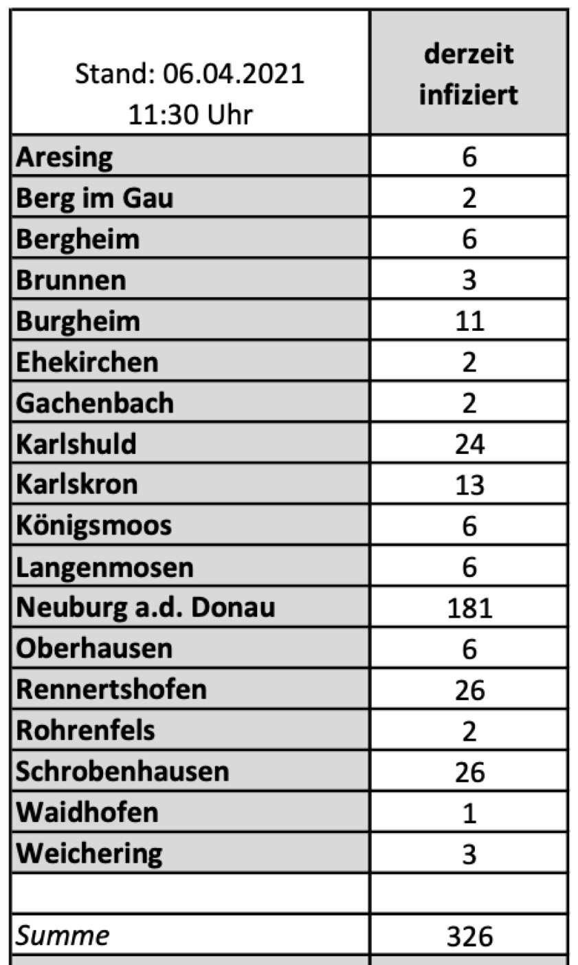 (ty) Im Kreis Neuburg-Schrobenhausen gibt es in Zusammenhang mit der Corona-Pandemie, wie berichtet, mittlerweile 65 Menschenleben zu beklagen. Die weitere Situation in dem Kreis stellt sich nach aktuellen Angaben des Landratsamts wie folgt dar: Bislang – Stand: heute, 11.30 Uhr – wurden 3304 Landkreis-Bürger positiv auf den neuartigen Erreger getestet. Die Zahl hat sich seit der gestrigen Meldung um 30 erhöht. Von den Infizierten gelten mittlerweile 2913 als genesen – sechs mehr als gestern. Momentan gibt es in dem Landkreis 326 aktive Corona-Fälle (gestern: 302). Aktuelle Zahlen aus den Gemeinden zeigt die Tabelle unten. Am 24. März lag die Sieben-Tages-Inzidenz zum dritten Mal in Folge über 100, deshalb gilt seit 26. März die so genannte Notbremse mit noch strengeren Regeln – untere anderem eine nächtliche Ausgangssperre (Das gilt ab 26. März im Kreis Neuburg-Schrobenhausen).