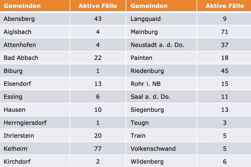 (ty) Im Kreis Kelheim gibt es in Zusammenhang mit der Corona-Pandemie, wie berichtet, mittlerweile 87 Menschenleben zu beklagen. Unter Verweis auf Daten des Gesundheitsamts teilte das Landratsamt heute mit, dass – Stand gestern, 16 Uhr – die Zahl der im Kreis Kelheim positiv auf den neuartigen Erreger getesteten Menschen bei insgesamt 4415 liegt – das sind 31 mehr als gestern gemeldet. Insgesamt 3887 hiesige Corona-Patienten (gestern: 3827) gelten mittlerweile als genesen und sind aus der Quarantäne entlassen. Derzeit gebe es 441 aktive Corona-Fälle (gestern: 470) im Landkreis. Zahlen aus den einzelnen Gemeinden zeigt die Tabelle unten. Angesichts der hohen Inzidenz-Werte gelten seit 20. März wegen der Corona-Notbremse wieder die strengen Regeln wie vor dem 8. März – darunter eine nächtliche Ausgangssperre.