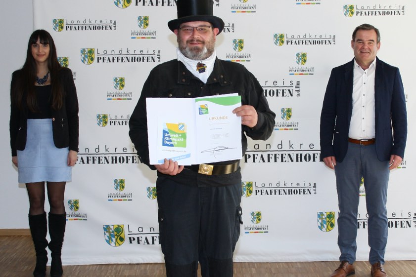 (ty) Der bevollmächtigte Bezirks-Kaminkehrer-Meister Andreas Reichhold aus Scheyern hat aus den Händen des Pfaffenhofener Landrats Albert Gürtner (FW) eine Urkunde für seine Teilnahme am "Umweltpakt Bayern" erhalten. Der Landrat sowie die zuständige Abteilungs-Leiterin an der Kreis-Behörde, Katharina Baschab, gratulierten ihm zu dieser Auszeichnung (Foto oben). Der "Umweltpakt Bayern" würdigt freiwilliges Engagement von Unternehmen im Freistaat für den betrieblichen Umweltschutz und nachhaltiges Wirtschaften. Um daran teilnehmen zu können, müssen eine bestimmte Zertifizierung des Betriebs vorliegen und weitere freiwillige Umweltleistungen erbracht werden.