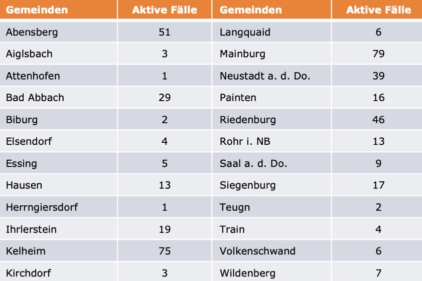 (ty) Im Kreis Kelheim gibt es in Zusammenhang mit der Corona-Pandemie zwei weitere Menschenleben zu beklagen. Wie das Landratsamt gegenüber unserer Zeitung mitteilte sind zwei mit dem Virus infizierte Frauen (Jahrgang 1939 und 1953) gestorben, die jeweils unter Vorerkrankungen litten. Damit erhöht sich die Zahl der infizierten Landkreis-Bürger, die gestorben sind, auf nunmehr 89. Unter Verweis auf Daten des Gesundheitsamts teilte das Landratsamt heute mit, dass – Stand gestern, 16 Uhr – die Zahl der im Kreis Kelheim positiv auf den neuartigen Erreger getesteten Menschen bei insgesamt 4513 liegt – das sind 52 mehr als gestern gemeldet. Insgesamt 3974 hiesige Corona-Patienten (gestern: 3934) gelten mittlerweile als genesen und sind aus der Quarantäne entlassen. Derzeit gebe es 450 aktive Corona-Fälle (gestern: 440) im Landkreis. Zahlen aus den einzelnen Gemeinden zeigt die Tabelle unten. Angesichts der hohen Inzidenz-Werte gelten seit 20. März wegen der Corona-Notbremse wieder die strengen Regeln wie vor dem 8. März – darunter eine nächtliche Ausgangssperre.
