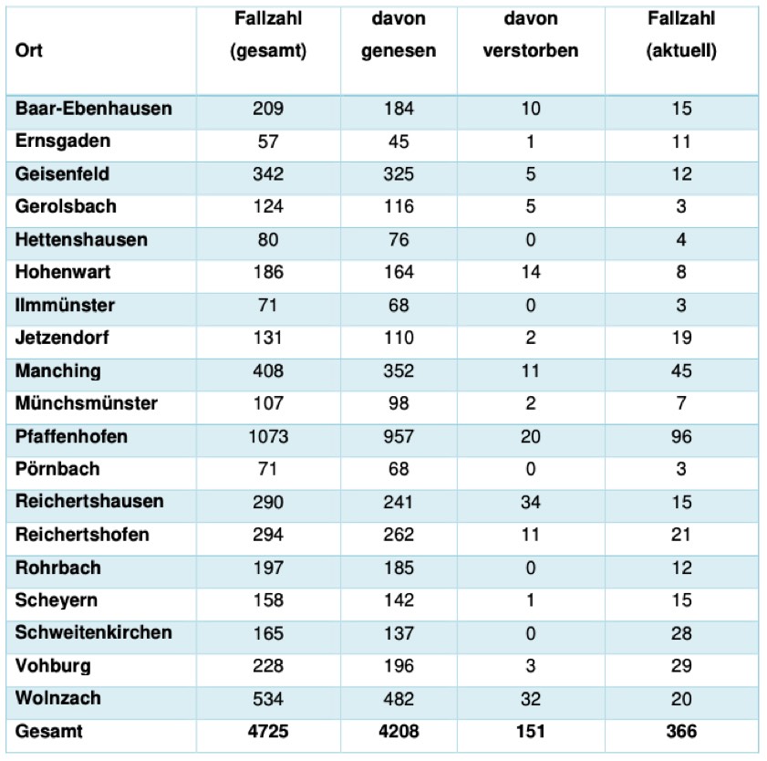 Von den bislang insgesamt 4725 Menschen aus dem Kreis Pfaffenhofen, bei denen nach jüngstem offiziellen Stand eine Corona-Infektion bestätigt worden ist, gelten laut aktueller Mitteilung der Behörde mittlerweile 4208 als genesen – das sind 26 mehr als gestern gemeldet. Die Zahl der Infizierten und noch nicht genesenen Corona-Patienten hat sich damit im Landkreis erhöht und beträgt – Stand: heute Nachmittag – derzeit 366 (gestern: 365). Die infizierten Personen befinden sich in häuslicher Isolation.