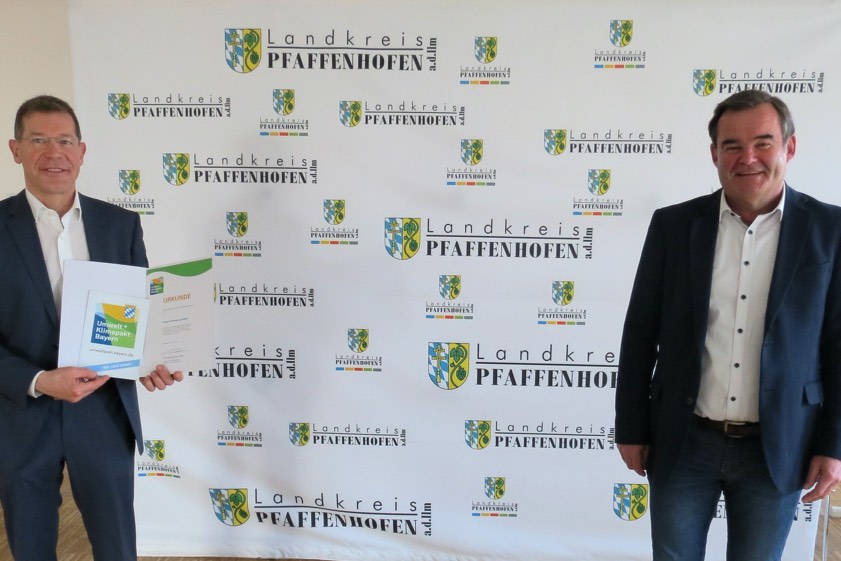 (ty) Die Braun-Entsorgung-GmbH aus Manching nimmt am bayerischen Umwelt- und Klimapakt teil. Der Pfaffenhofener Landrat Albert Gürtner (Foto oben, rechts) überreichte an Geschäftsführer Thomas Leistritz (links) die entsprechende Urkunde. Im Rahmen des von der Staatsregierung und der bayerischen Wirtschaft abgeschlossenen Pakts hat sich das Unternehmen zu qualifizierten, freiwilligen Umweltleistungen verpflichtet und wurde somit vom bayerischen Ministerium für Umwelt, Gesundheit und Verbraucherschutz als Teilnehmer bestätigt.