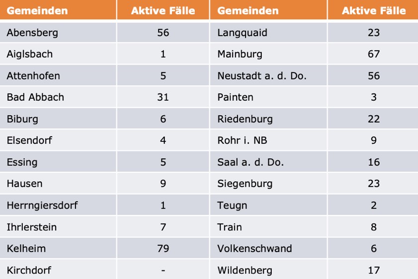 (ty) Im Kreis Kelheim gibt es in Zusammenhang mit der Corona-Pandemie, wie berichtet, mittlerweile 94 Menschenleben zu beklagen. Unter Verweis auf Daten des Gesundheitsamts teilte das Landratsamt heute mit, dass – Stand gestern, 16 Uhr – die Zahl der im Kreis Kelheim positiv auf den neuartigen Erreger getesteten Menschen bei insgesamt 4894 liegt – das sind 51 mehr als gestern gemeldet. Insgesamt 4344 hiesige Corona-Patienten (gestern: 4303) gelten mittlerweile als genesen und sind aus der Quarantäne entlassen. Derzeit gebe es 456 aktive Corona-Fälle (gestern: 446) im Landkreis. Zahlen aus den einzelnen Gemeinden zeigt die Tabelle unten. Angesichts der hohen Inzidenz-Werte gelten seit 20. März wegen der Corona-Notbremse wieder die strengen Regeln wie vor dem 8. März – darunter eine nächtliche Ausgangssperre. Seit 16. April greifen inzidenz-bedingt zudem weitere Verschärfungen beim Einzelhandel.