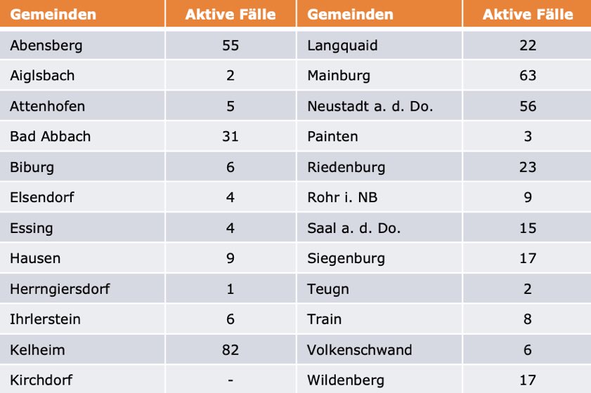 (ty) Im Kreis Kelheim gibt es in Zusammenhang mit der Corona-Pandemie, wie berichtet, mittlerweile 94 Menschenleben zu beklagen. Unter Verweis auf Daten des Gesundheitsamts teilte das Landratsamt heute mit, dass – Stand gestern, 16 Uhr – die Zahl der im Kreis Kelheim positiv auf den neuartigen Erreger getesteten Menschen bei insgesamt 4933 liegt – das sind 39 mehr als gestern gemeldet. Insgesamt 4393 hiesige Corona-Patienten (gestern: 4344) gelten mittlerweile als genesen und sind aus der Quarantäne entlassen. Derzeit gebe es 446 aktive Corona-Fälle (gestern: 456) im Landkreis. Zahlen aus den einzelnen Gemeinden zeigt die Tabelle unten. Angesichts der hohen Inzidenz-Werte gelten seit 20. März wegen der Corona-Notbremse wieder die strengen Regeln wie vor dem 8. März – darunter eine nächtliche Ausgangssperre. Seit 16. April greifen inzidenz-bedingt zudem weitere Verschärfungen beim Einzelhandel.