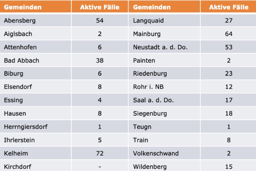 (ty) Im Kreis Kelheim gibt es in Zusammenhang mit der Corona-Pandemie, wie berichtet, mittlerweile 94 Menschenleben zu beklagen. Unter Verweis auf Daten des Gesundheitsamts teilte das Landratsamt heute mit, dass – Stand gestern, 16 Uhr – die Zahl der im Kreis Kelheim positiv auf den neuartigen Erreger getesteten Menschen bei insgesamt 5026 liegt – das sind 47 mehr als gestern gemeldet. Insgesamt 4486 hiesige Corona-Patienten (gestern: 4444) gelten mittlerweile als genesen und sind aus der Quarantäne entlassen. Derzeit gebe es 446 aktive Corona-Fälle (gestern: 441) im Landkreis. Zahlen aus den einzelnen Gemeinden zeigt die Tabelle unten. Angesichts der hohen Inzidenz-Werte gelten seit 20. März wegen der Corona-Notbremse wieder die strengen Regeln wie vor dem 8. März – darunter eine nächtliche Ausgangssperre. Seit 16. April greifen inzidenz-bedingt zudem weitere Verschärfungen beim Einzelhandel.