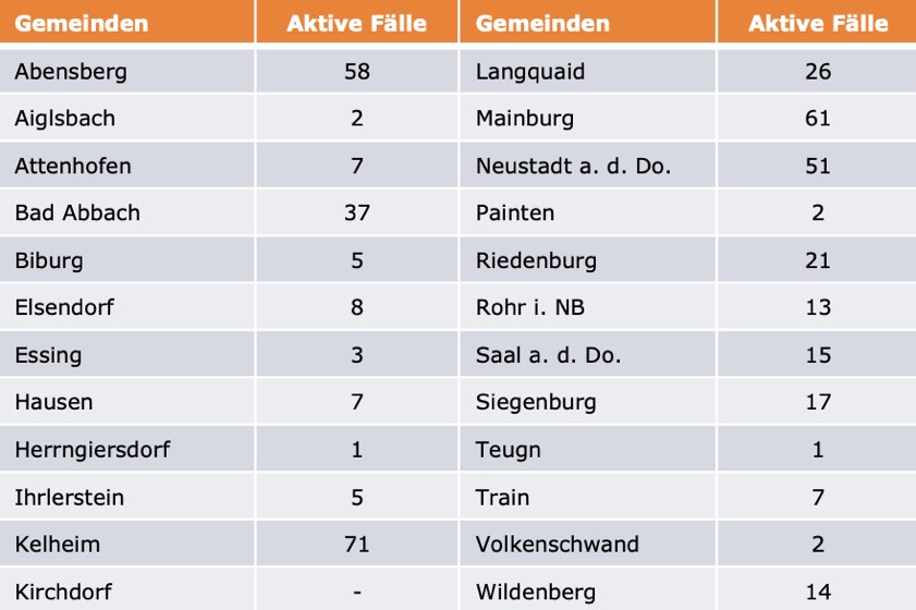 (ty) Im Kreis Kelheim gibt es in Zusammenhang mit der Corona-Pandemie, wie berichtet, mittlerweile 94 Menschenleben zu beklagen. Unter Verweis auf Daten des Gesundheitsamts teilte das Landratsamt heute mit, dass – Stand gestern, 16 Uhr – die Zahl der im Kreis Kelheim positiv auf den neuartigen Erreger getesteten Menschen bei insgesamt 5056 liegt – das sind 30 mehr als gestern gemeldet. Insgesamt 4528 hiesige Corona-Patienten (gestern: 4486) gelten mittlerweile als genesen und sind aus der Quarantäne entlassen. Derzeit gebe es 434 aktive Corona-Fälle (gestern: 446) im Landkreis. Zahlen aus den einzelnen Gemeinden zeigt die Tabelle unten. Angesichts der hohen Inzidenz-Werte gelten seit 20. März wegen der Corona-Notbremse wieder die strengen Regeln wie vor dem 8. März – darunter eine nächtliche Ausgangssperre. Seit 16. April greifen inzidenz-bedingt zudem weitere Verschärfungen beim Einzelhandel.