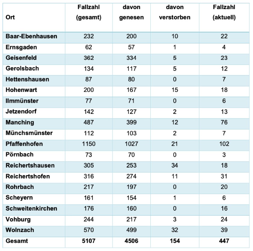 Von den bislang insgesamt 5107 Menschen aus dem Kreis Pfaffenhofen, bei denen nach jüngstem offiziellen Stand eine Corona-Infektion bestätigt worden ist, gelten laut aktueller Mitteilung der Behörde mittlerweile 4506 als genesen – das sind 27 mehr als gestern gemeldet. Die Zahl der Infizierten und noch nicht genesenen Corona-Patienten hat sich damit im Landkreis erhöht und beträgt – Stand: heute Nachmittag – derzeit 447 (gestern: 427). Die infizierten Personen befinden sich in häuslicher Isolation.