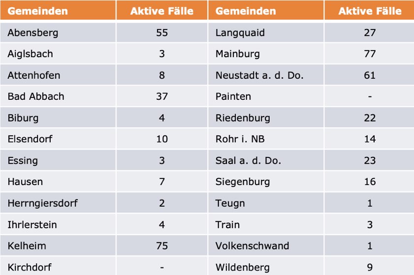 (ty) Im Kreis Kelheim gibt es in Zusammenhang mit der Corona-Pandemie, wie berichtet, mittlerweile 94 Menschenleben zu beklagen. Unter Verweis auf Daten des Gesundheitsamts teilte das Landratsamt heute mit, dass – Stand gestern, 16 Uhr – die Zahl der im Kreis Kelheim positiv auf den neuartigen Erreger getesteten Menschen bei insgesamt 5155 liegt – das sind 41 mehr als gestern gemeldet. Insgesamt 4599 hiesige Corona-Patienten (gestern: 4574) gelten mittlerweile als genesen und sind aus der Quarantäne entlassen. Derzeit gebe es 462 aktive Corona-Fälle (gestern: 436) im Landkreis. Zahlen aus den einzelnen Gemeinden zeigt die Tabelle unten. Angesichts der hohen Inzidenz-Werte gelten seit 20. März wegen der Corona-Notbremse wieder die strengen Regeln wie vor dem 8. März – darunter eine nächtliche Ausgangssperre. Seit 16. April greifen inzidenz-bedingt zudem weitere Verschärfungen beim Einzelhandel.
