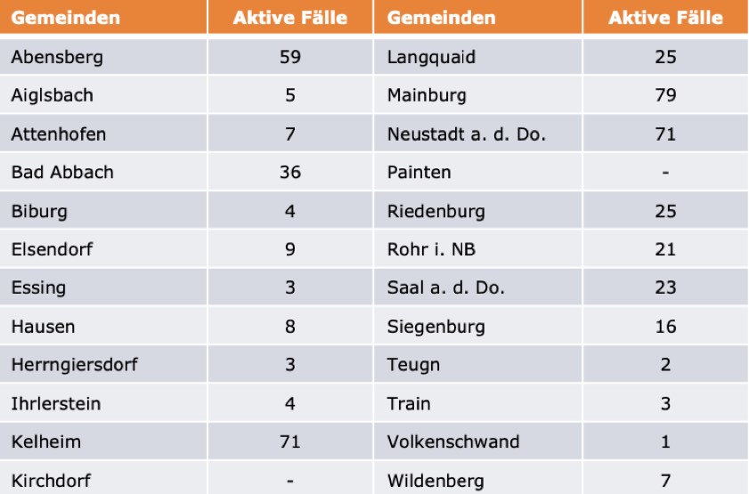 (ty) Im Kreis Kelheim gibt es in Zusammenhang mit der Corona-Pandemie acht weitere Menschenleben zu beklagen. Wie das Landratsamt heute mitteilte, sind diese mit dem Virus infizierten Frauen und Männer bereits in den vergangenen Wochen gestorben. "Der Meldeverzug liegt der gründlichen Feststellung der Todesursache und der anschließenden Übermittlung an das Gesundheitsamt zugrunde", heißt es dazu. Unter Verweis auf Daten des Gesundheitsamts teilte das Landratsamt heute mit, dass – Stand gestern, 16 Uhr – die Zahl der im Kreis Kelheim positiv auf den neuartigen Erreger getesteten Menschen bei insgesamt 5221 liegt – das sind 66 mehr als gestern gemeldet. Insgesamt 4637 hiesige Corona-Patienten (gestern: 4599) wurden wieder aus der Quarantäne entlassen. Derzeit gebe es 482 aktive Corona-Fälle im Landkreis. Zahlen aus den einzelnen Gemeinden zeigt die Tabelle unten.