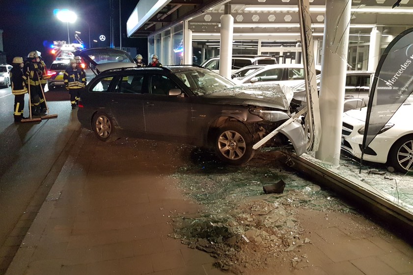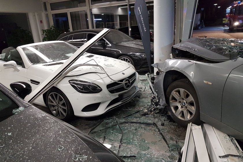 Am Pkw des Unfall-Verursachers sei ein wirtschaftlicher Totalschaden entstanden. Neben vier Schaufenster-Scheiben des Autohauses wurden laut Mitteilung der Polizei in dem Ausstellungsraum ein Neuwagen und drei Jahreswagen in Mitleidenschaft gezogen. Nach bisherigen Schätzungen belaufe sich der Sachschaden auf insgesamt zirka 100 000 Euro. Allerdings müsse erst noch im Zuge eines Gutachtens geklärt werden, ob auch ein Schaden an der Statik des Gebäudes entstanden ist.