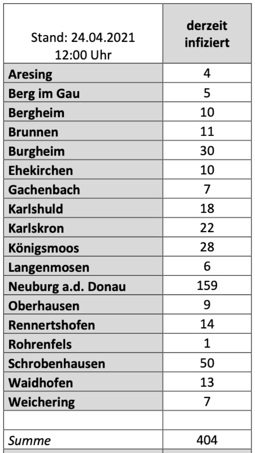 (ty) Im Kreis Neuburg-Schrobenhausen gibt es in Zusammenhang mit der Corona-Pandemie, wie berichtet, mittlerweile 71 Menschenleben zu beklagen. Die weitere Situation in dem Kreis stellt sich nach aktuellen Angaben des Landratsamts wie folgt dar: Bislang – Stand: heute, 12 Uhr – wurden 3755 Landkreis-Bürger positiv auf den neuartigen Erreger getestet. Die Zahl hat sich seit der gestrigen Meldung um 29 erhöht. Von den Infizierten gelten mittlerweile 3280 als genesen – 24 mehr als gestern. Momentan gibt es im Landkreis 404 aktive Corona-Fälle (gestern: 399). Aktuelle Zahlen aus den Gemeinden zeigt die Tabelle unten.