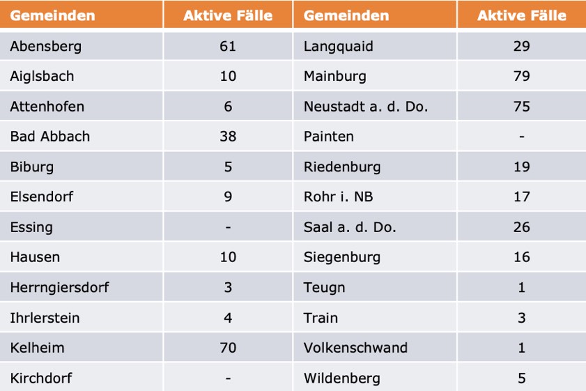 (ty) Im Kreis Kelheim gibt es in Zusammenhang mit der Corona-Pandemie, wie berichtet, mittlerweile 102 Menschenleben zu beklagen. Die weitere Situation stellt sich wie folgt dar: Unter Verweis auf Daten des Gesundheitsamts teilte das Landratsamt heute mit, dass – Stand gestern, 16 Uhr – die Zahl der im Kreis Kelheim positiv auf den neuartigen Erreger getesteten Menschen bei insgesamt 5296 liegt – das sind 44 mehr als gestern gemeldet. Insgesamt 4707 hiesige Corona-Patienten (gestern: 4669) wurden wieder aus der Quarantäne entlassen und gelten als genesen. Derzeit gebe es 487 aktive Corona-Fälle im Landkreis (gestern: 481). Zahlen aus den einzelnen Gemeinden zeigt die Tabelle unten.