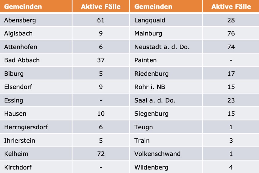 (ty) Im Kreis Kelheim gibt es in Zusammenhang mit der Corona-Pandemie zwei weitere Menschenleben zu beklagen. Wie das Landratsamt heute gegenüber unserer Redaktion erklärte, sind eine Frau (Jahrgang 1934) und ein Mann (Jahrgang 1944) gestorben, die mit dem Virus infiziert waren und jeweils unter Vorerkrankungen litten. Damit erhöht sich die Zahl der infizierten Landkreis-Bürger, die gestorben sind, auf nunmehr 104. Die weitere Situation stellt sich wie folgt dar: Unter Verweis auf Daten des Gesundheitsamts teilte das Landratsamt heute mit, dass – Stand gestern, 16 Uhr – die Zahl der im Kreis Kelheim positiv auf den neuartigen Erreger getesteten Menschen bei insgesamt 5317 liegt – das sind 21 mehr als gestern gemeldet. Insgesamt 4736 hiesige Corona-Patienten (gestern: 4707) wurden wieder aus der Quarantäne entlassen und gelten als genesen. Derzeit gebe es 477 aktive Corona-Fälle im Landkreis (gestern: 487). Zahlen aus den einzelnen Gemeinden zeigt die Tabelle unten.