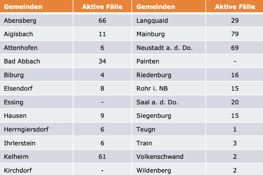 (ty) Im Kreis Kelheim gibt es in Zusammenhang mit der Corona-Pandemie, wie berichtet, mittlerweile 104 Menschenleben zu beklagen. Die weitere Situation stellt sich wie folgt dar: Unter Verweis auf Daten des Gesundheitsamts teilte das Landratsamt heute mit, dass – Stand gestern, 16 Uhr – die Zahl der im Kreis Kelheim positiv auf den neuartigen Erreger getesteten Menschen bei insgesamt 5353 liegt – das sind 36 mehr als gestern gemeldet. Insgesamt 4787 hiesige Corona-Patienten (gestern: 4736) wurden wieder aus der Quarantäne entlassen und gelten als genesen. Derzeit gebe es 462 aktive Corona-Fälle im Landkreis (gestern: 477). Zahlen aus den einzelnen Gemeinden zeigt die Tabelle unten.