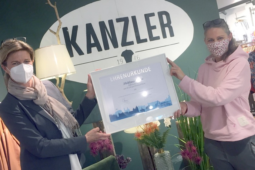 (ty) Anlässlich des 225-jährigen Bestehens der Firma Kanzler hat Elke Christian, die Leiterin der IHK-Geschäftsstelle in Ingolstadt, der Inhaberin des Pfaffenhofener Traditionshauses, Eva Kanzler, gratuliert. Sie überreichte der Unternehmerin eine Ehrenurkunde der IHK für München und Oberbayern (Foto oben). Eva Kanzler führt den anno 1796 als Gerberei gegründeten Einzelhandels-Betrieb mittlerweile in der fünften Generation. Den Textilhandel gründete damals, es war im Jahre 1946, ihre Großmutter Maria Kanzler. Das Modehaus beschäftigt heute elf Mitarbeiter.