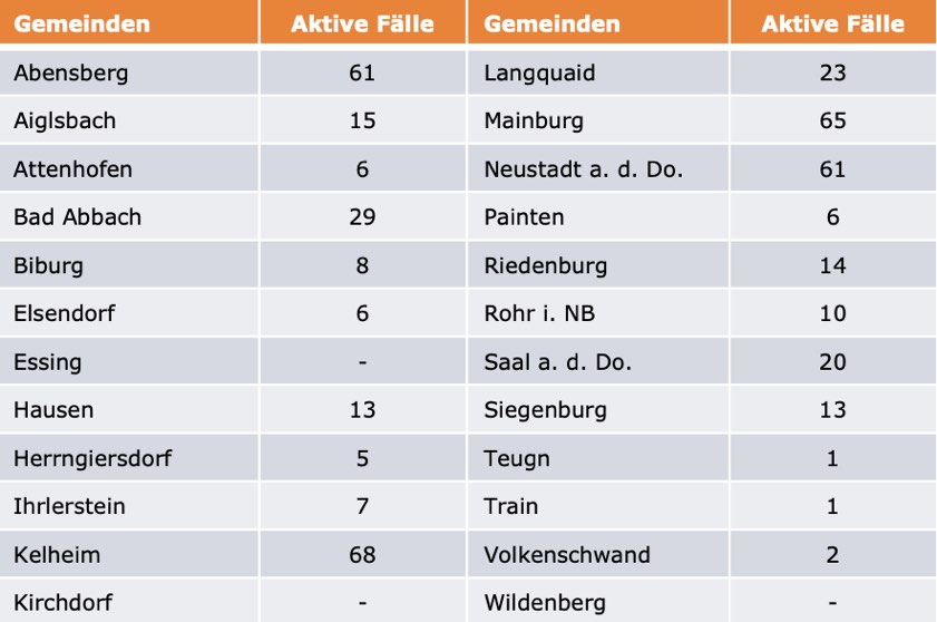 (ty) Im Kreis Kelheim gibt es in Zusammenhang mit der Corona-Pandemie ein weiteres Menschenleben zu beklagen. Wie das Landratsamt heute mitteilte, ist ein mit dem Virus infizierter Mann (Jahrgang 1953) gestorben, der keine Vorerkrankungen hatte. Damit erhöht sich die Zahl der mit Corona infizierten Landkreis-Bürger, die gestorben sind, auf nunmehr 105. Die weitere Situation stellt sich wie folgt dar: Unter Verweis auf Daten des Gesundheitsamts teilte das Landratsamt heute mit, dass – Stand gestern, 16 Uhr – die Zahl der im Kreis Kelheim positiv auf den neuartigen Erreger getesteten Menschen bei insgesamt 5501 liegt – das sind 25 mehr als gestern gemeldet. Insgesamt 4962 hiesige Corona-Patienten (gestern: 4908) wurden wieder aus der Quarantäne entlassen und gelten als genesen. Derzeit gebe es 434 aktive Corona-Fälle im Landkreis (gestern: 464). Zahlen aus den einzelnen Gemeinden zeigt die Tabelle unten.