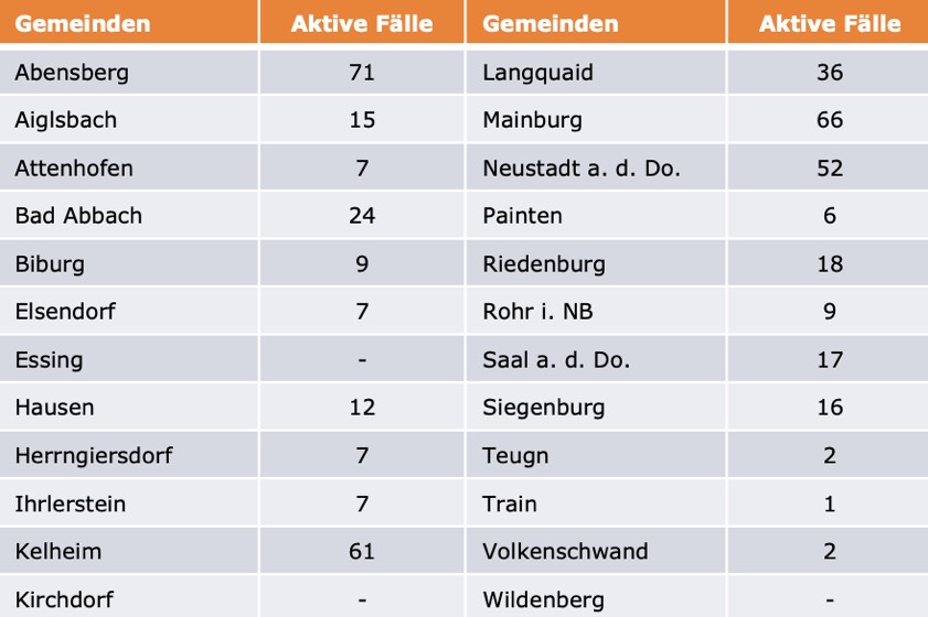 (ty) Im Kreis Kelheim gibt es in Zusammenhang mit der Corona-Pandemie, wie berichtet, mittlerweile 105 Menschenleben zu beklagen. Die weitere Situation stellt sich wie folgt dar: Unter Verweis auf Daten des Gesundheitsamts teilte das Landratsamt heute mit, dass – Stand gestern, 16 Uhr – die Zahl der im Kreis Kelheim positiv auf den neuartigen Erreger getesteten Menschen bei insgesamt 5565 liegt – das sind 29 mehr als gestern gemeldet. Insgesamt 5015 hiesige Corona-Patienten (gestern: 4985) wurden wieder aus der Quarantäne entlassen und gelten als genesen. Derzeit gebe es 445 aktive Corona-Fälle im Landkreis (gestern: 446). Zahlen aus den einzelnen Gemeinden zeigt die Tabelle unten.