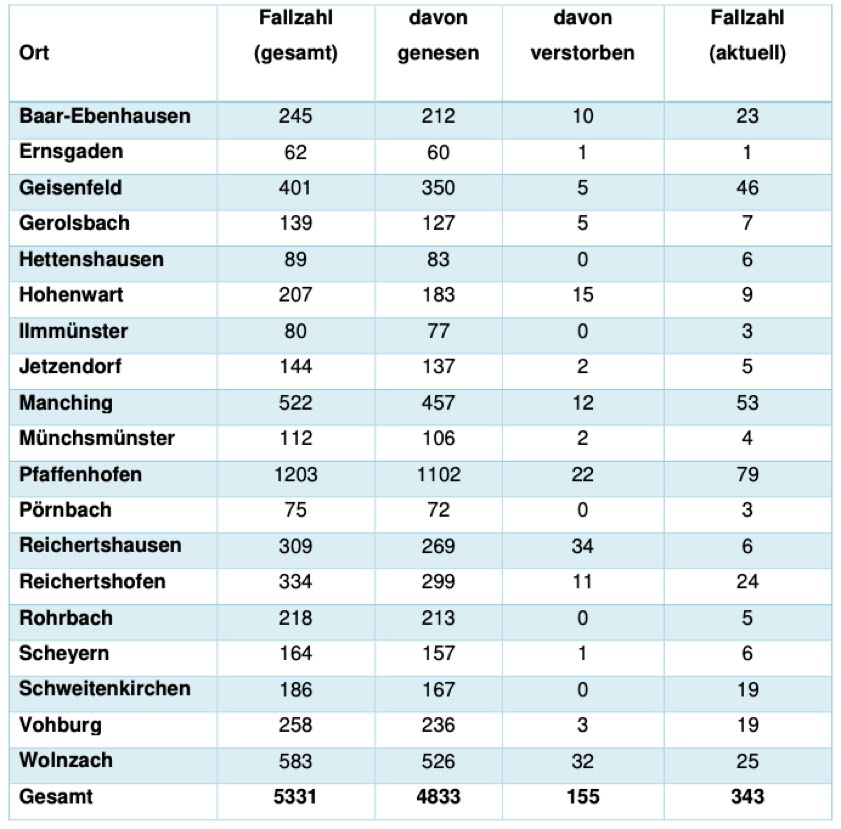 Von den bislang insgesamt 5331 Menschen aus dem Kreis Pfaffenhofen, bei denen nach jüngstem offiziellen Stand eine Corona-Infektion bestätigt worden ist, gelten laut aktueller Mitteilung der Behörde mittlerweile 4833 als genesen – das sind 20 mehr als gestern gemeldet. Die Zahl der Infizierten und noch nicht genesenen Corona-Patienten hat sich damit im Landkreis verringert und beträgt – Stand: heute Nachmittag – derzeit 343 (gestern: 354). Die infizierten Personen befinden sich in häuslicher Isolation.