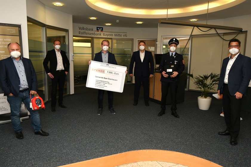 (ty) Die Volksbank-Raiffeisenbank Bayern-Mitte hat jetzt insgesamt mehr als 7000 Euro in den Raum Baar-Ebenhausen gespendet. Die Gemeinde selbst erhielt dabei eine Anlage zur Geschwindigkeits-Messung mitsamt entsprechender Anzeige-Tafel. "Diese soll die Verkehrs-Sicherheit der Kinder auf dem Schulweg erhöhen", wurde dazu erklärt. Außerdem finanzierte das Geldinstitut zwei Defibrillatoren, die im Notfall Menschenleben retten können. Eines dieser Geräte findet sich künftig im Eingangs-Bereich der hiesigen Bank-Filiale und steht damit jederzeit zur Verfügung. Den anderen Defibrillator erhielt die Feuerwehr von Ebenhausen zum mobilen Einsatz.