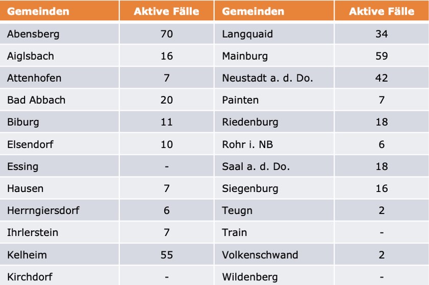 (ty) Im Kreis Kelheim gibt es in Zusammenhang mit der Corona-Pandemie, wie berichtet, mittlerweile 105 Menschenleben zu beklagen. Die weitere Situation stellt sich wie folgt dar: Unter Verweis auf Daten des Gesundheitsamts teilte das Landratsamt heute mit, dass – Stand gestern, 16 Uhr – die Zahl der im Kreis Kelheim positiv auf den neuartigen Erreger getesteten Menschen bei insgesamt 5584 liegt – das sind 19 mehr als gestern gemeldet. Insgesamt 5066 hiesige Corona-Patienten (gestern: 5015) wurden wieder aus der Quarantäne entlassen und gelten als genesen. Derzeit gebe es 413 aktive Corona-Fälle im Landkreis (gestern: 445). Zahlen aus den einzelnen Gemeinden zeigt die Tabelle unten.