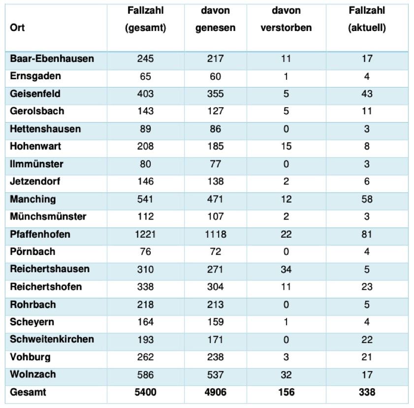 (ty) In Zusammenhang mit der Corona-Pandemie gibt es im Kreis Pfaffenhofen, ein weiteres Menschenleben zu beklagen. Wie das Landratsamt heute mitteilte, ist eine mit dem Virus infizierte Person im Alter von über 70 Jahren aus dem Gemeinde-Bereich von Baar-Ebenhausen gestorben. Damit erhöht sich die Zahl der infizierten Landkreis-Bürger, die gestorben sind, auf nunmehr 156. Das Landratsamt veröffentlicht eine tägliche Übersicht (siehe unten), in welchen Gemeinden die mit dem Virus infizierten Menschen, die gestorben sind, gelebt haben beziehungsweise wie viele bestätigte Infektionsfälle und genesene Patienten es in welcher Kommune gibt. Die Zahl der Landkreis-Bürger, die positiv auf den neuartigen Erreger getestet worden sind, hat sich seit der Meldung von gestern um 38 erhöht und beträgt jetzt 5400. Mittlerweile greifen Erleichterungen; lesen Sie dazu: Im Landkreis Pfaffenhofen gelten ab 5. Mai gelockerte Corona-Regelungen
