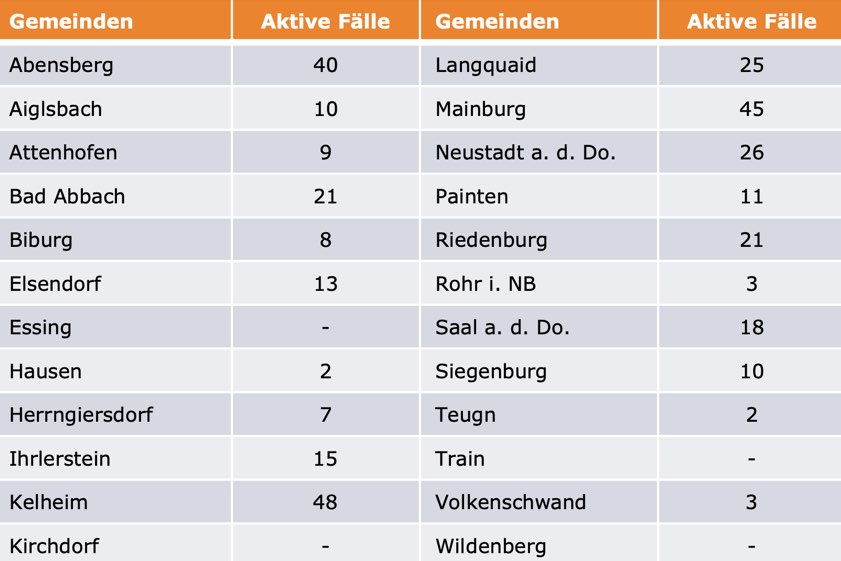 (ty) Im Kreis Kelheim gibt es in Zusammenhang mit der Corona-Pandemie, wie berichtet, mittlerweile 105 Menschenleben zu beklagen. Die weitere Situation stellt sich wie folgt dar: Unter Verweis auf Daten des Gesundheitsamts teilte das Landratsamt heute mit, dass – Stand gestern, 16 Uhr – die Zahl der im Kreis Kelheim positiv auf den neuartigen Erreger getesteten Menschen bei insgesamt 5708 liegt – das sind 21 mehr als gestern gemeldet. Insgesamt 5266 hiesige Corona-Patienten (gestern: 5226) wurden wieder aus der Quarantäne entlassen und gelten als genesen. Derzeit gebe es 337 aktive Corona-Fälle im Landkreis (gestern: 356). Zahlen aus den einzelnen Gemeinden zeigt die Tabelle unten.