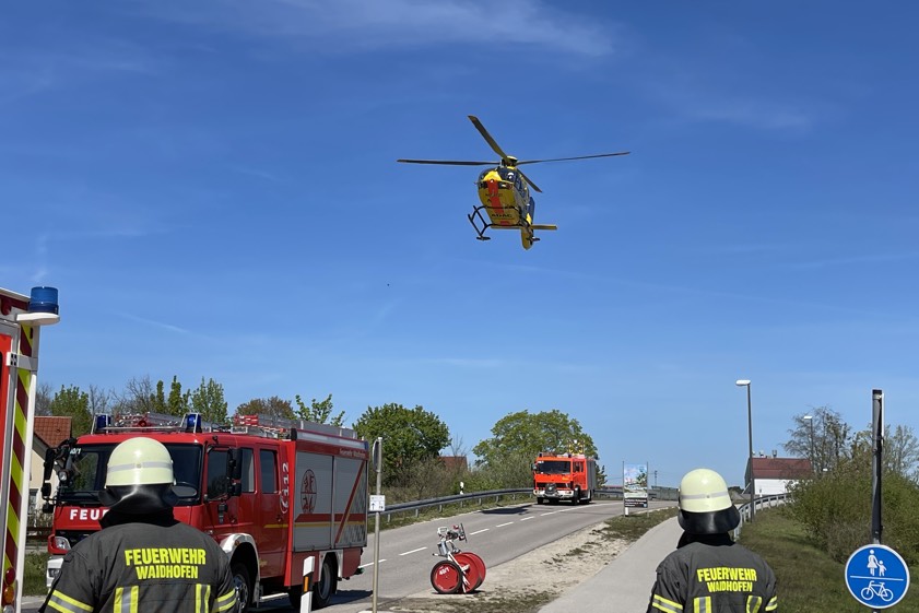 (ty) Im Gemeinde-Bereich von Waidhofen hat sich am heutigen Vormittag ein folgenreicher Verkehrsunfall ereignet. Wie die Polizei berichtet, übersah an einer Einmündung im Ortsteil Rachelsbach eine 18 Jahre alte Pkw-Lenkerin aus dem Gemeinde-Gebiet von Schrobenhausen einen von rechts – auf der vorfahrtsberechtigten Straße – kommenden 57-Jährigen aus dem Landkreis Dachau, der mit einem Elektro-Motorrad unterwegs war. Nach Angaben der Polizei prallte der Zweirad-Fahrer zunächst gegen die rechte Seite des Autos und kam daraufhin zu Sturz.