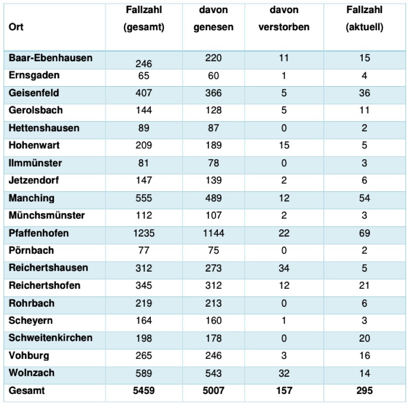 (ty) In Zusammenhang mit der Corona-Pandemie gibt es im Kreis Pfaffenhofen, wie berichtet, mittlerweile 157 Menschenleben zu beklagen. Das Landratsamt veröffentlicht eine tägliche Übersicht (siehe unten), in welchen Gemeinden die mit dem Virus infizierten Menschen, die gestorben sind, gelebt haben beziehungsweise wie viele bestätigte Infektionsfälle und genesene Patienten es in welcher Kommune gibt. Die Zahl der Landkreis-Bürger, die positiv auf den neuartigen Erreger getestet worden sind, hat sich seit der Meldung von gestern nicht erhöht und beträgt somit momentan 5459.