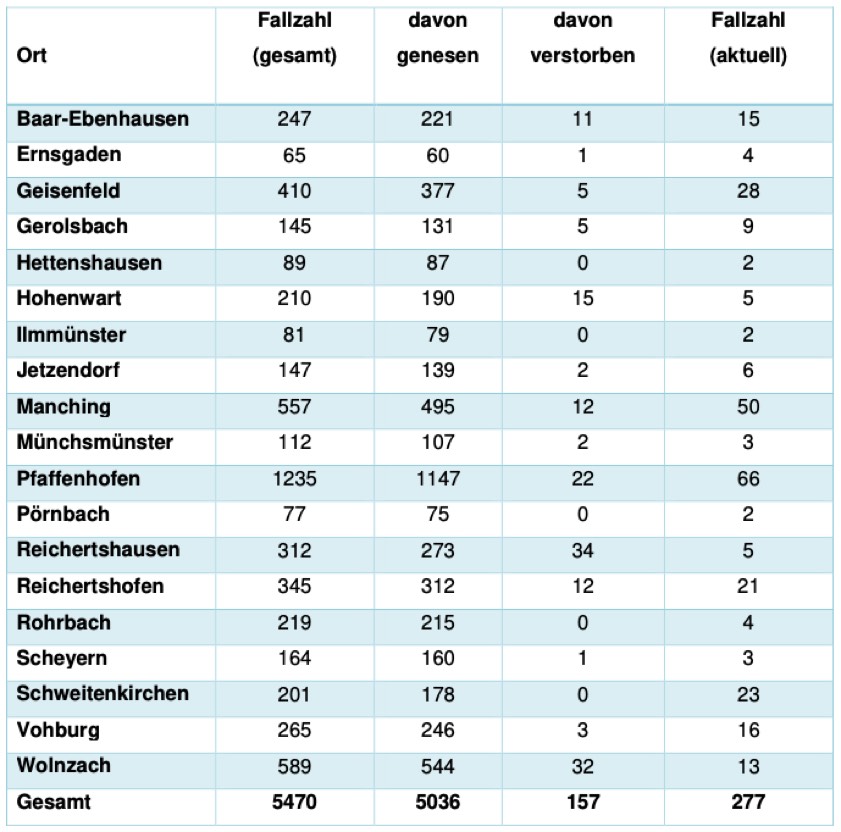 (ty) In Zusammenhang mit der Corona-Pandemie gibt es im Kreis Pfaffenhofen, wie berichtet, mittlerweile 157 Menschenleben zu beklagen. Das Landratsamt veröffentlicht eine tägliche Übersicht (siehe unten), in welchen Gemeinden die mit dem Virus infizierten Menschen, die gestorben sind, gelebt haben beziehungsweise wie viele bestätigte Infektionsfälle und genesene Patienten es in welcher Kommune gibt. Die Zahl der Landkreis-Bürger, die positiv auf den neuartigen Erreger getestet worden sind, hat sich seit der Meldung von gestern um elf erhöht und beträgt somit momentan 5470.