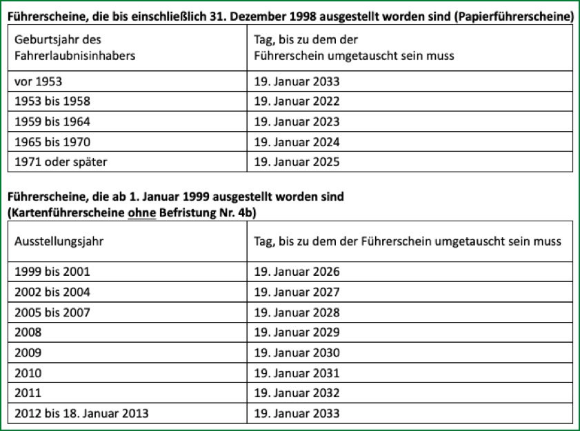 - Wichtig: Nach Ablauf der genannten Fristen werden die bisherigen Führerscheine ungültig.