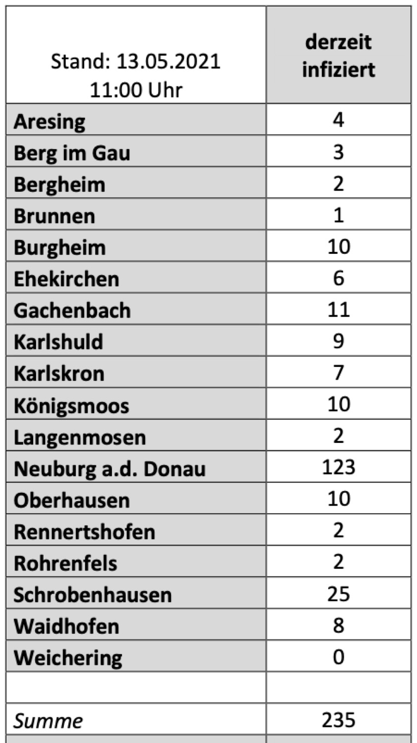 (ty) Im Kreis Neuburg-Schrobenhausen gibt es in Zusammenhang mit der Corona-Pandemie, wie berichtet, mittlerweile 72 Menschenleben zu beklagen. Die weitere Situation in dem Kreis stellt sich nach aktuellen Angaben des Landratsamts wie folgt dar: Bislang – Stand: heute, 11 Uhr – wurden 4007 Landkreis-Bürger positiv auf den neuartigen Erreger getestet. Die Zahl hat sich seit der gestrigen Meldung um zwölf erhöht. Von den Infizierten gelten mittlerweile 3700 als genesen – 19 mehr als gestern. Momentan gibt es im Landkreis 235 aktive Corona-Fälle (gestern: 242). Aktuelle Zahlen aus den Gemeinden zeigt die Tabelle unten. Inzidenz-bedingt durften Außen-Gastronomie, Kinos und Theater am 11. Mai wieder öffnen.