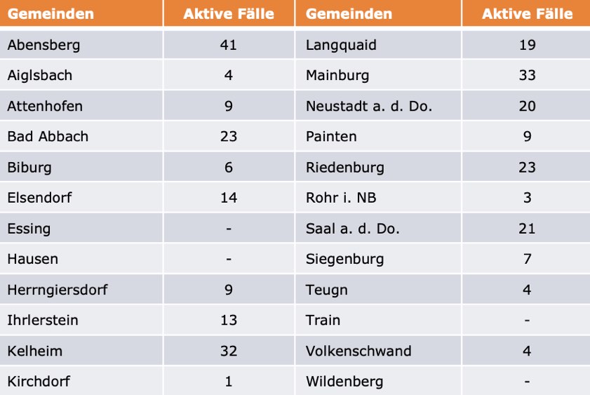 (ty) Im Kreis Kelheim gibt es in Zusammenhang mit der Corona-Pandemie, wie berichtet, mittlerweile 105 Menschenleben zu beklagen. Die weitere Situation stellt sich wie folgt dar: Unter Verweis auf Daten des Gesundheitsamts teilte das Landratsamt heute mit, dass – Stand gestern, 16 Uhr – die Zahl der im Kreis Kelheim positiv auf den neuartigen Erreger getesteten Menschen bei insgesamt 5786 liegt – das sind 32 mehr als gestern gemeldet. Insgesamt 5386 hiesige Corona-Patienten (gestern: 5354) wurden wieder aus der Quarantäne entlassen und gelten als genesen. Derzeit gebe es 295 aktive Corona-Fälle im Landkreis (gestern: 295). Zahlen aus den einzelnen Gemeinden zeigt die Tabelle unten.