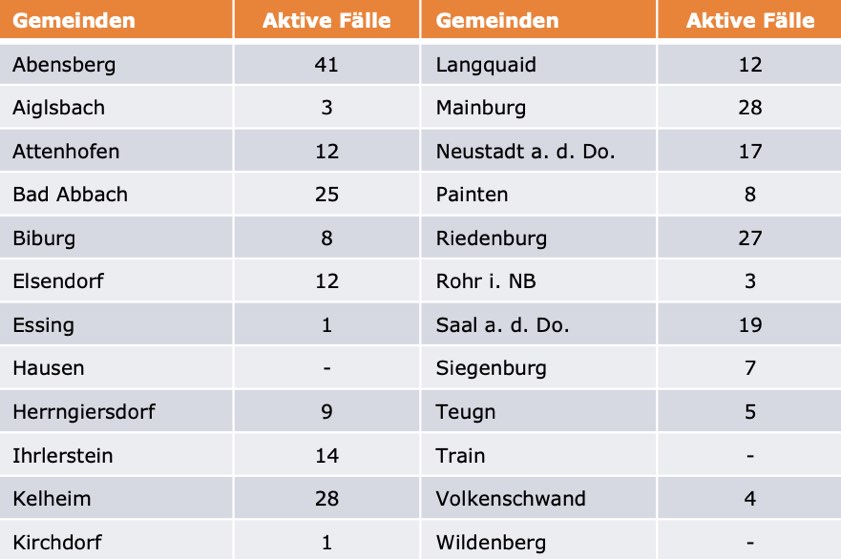 (ty) Im Kreis Kelheim gibt es in Zusammenhang mit der Corona-Pandemie, wie berichtet, mittlerweile 105 Menschenleben zu beklagen. Die weitere Situation stellt sich wie folgt dar: Unter Verweis auf Daten des Gesundheitsamts teilte das Landratsamt heute mit, dass – Stand gestern, 16 Uhr – die Zahl der im Kreis Kelheim positiv auf den neuartigen Erreger getesteten Menschen bei insgesamt 5814 liegt – das sind 28 mehr als gestern gemeldet. Insgesamt 5425 hiesige Corona-Patienten (gestern: 5386) wurden wieder aus der Quarantäne entlassen und gelten als genesen. Derzeit gebe es 284 aktive Corona-Fälle im Landkreis (gestern: 295). Zahlen aus den einzelnen Gemeinden zeigt die Tabelle unten.