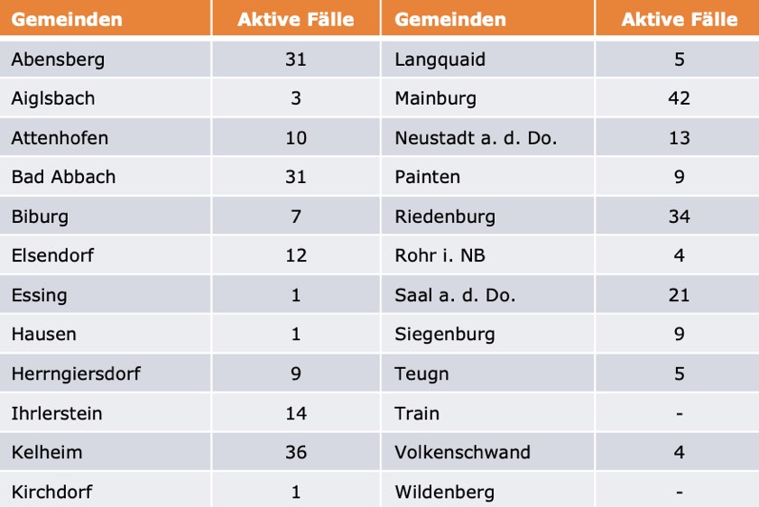 (ty) Im Kreis Kelheim gibt es in Zusammenhang mit der Corona-Pandemie, wie berichtet, mittlerweile 105 Menschenleben zu beklagen. Die weitere Situation stellt sich wie folgt dar: Unter Verweis auf Daten des Gesundheitsamts teilte das Landratsamt heute mit, dass – Stand gestern, 16 Uhr – die Zahl der im Kreis Kelheim positiv auf den neuartigen Erreger getesteten Menschen bei insgesamt 5866 liegt – das sind 52 mehr als gestern gemeldet. Insgesamt 5459 hiesige Corona-Patienten (gestern: 5425) wurden wieder aus der Quarantäne entlassen und gelten als genesen. Derzeit gebe es 302 aktive Corona-Fälle im Landkreis (gestern: 284). Zahlen aus den einzelnen Gemeinden zeigt die Tabelle unten.
