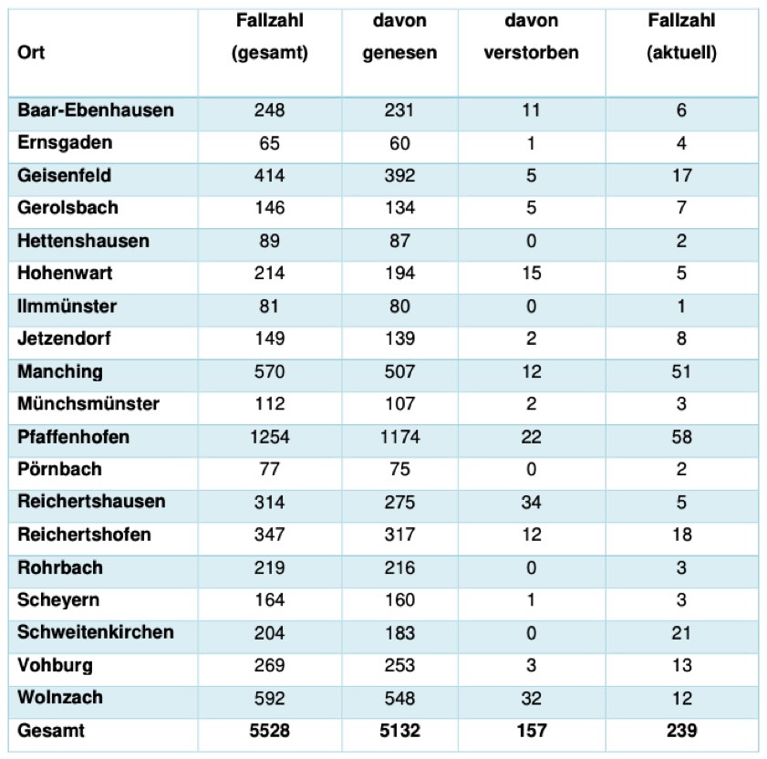 Von den bislang insgesamt 5528 Menschen aus dem Kreis Pfaffenhofen, bei denen nach jüngstem offiziellen Stand eine Corona-Infektion bestätigt worden ist, gelten laut aktueller Mitteilung der Behörde mittlerweile 5132 als genesen – das sind 48 mehr als am Freitag gemeldet. Die Zahl der Infizierten und noch nicht genesenen Corona-Patienten hat sich damit im Landkreis verringert und beträgt – Stand: heute Vormittag – derzeit 239 (Freitag: 267). Die infizierten Personen befinden sich in häuslicher Isolation.