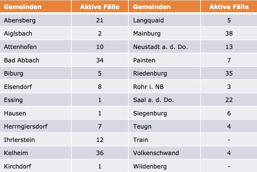 (ty) Im Kreis Kelheim gibt es in Zusammenhang mit der Corona-Pandemie, wie berichtet, mittlerweile 105 Menschenleben zu beklagen. Die weitere Situation stellt sich wie folgt dar: Unter Verweis auf Daten des Gesundheitsamts teilte das Landratsamt heute mit, dass – Stand gestern, 16 Uhr – die Zahl der im Kreis Kelheim positiv auf den neuartigen Erreger getesteten Menschen bei insgesamt 5892 liegt – das sind 21 mehr als gestern gemeldet. Insgesamt 5512 hiesige Corona-Patienten (gestern: 5491) wurden wieder aus der Quarantäne entlassen und gelten als genesen. Derzeit gebe es 275 aktive Corona-Fälle im Landkreis (gestern: 275). Zahlen aus den einzelnen Gemeinden zeigt die Tabelle unten.