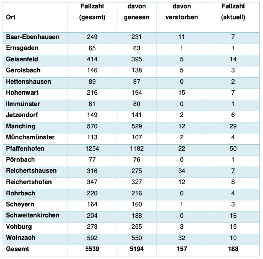 Von den bislang insgesamt 5539 Menschen aus dem Kreis Pfaffenhofen, bei denen nach jüngstem offiziellen Stand eine Corona-Infektion bestätigt worden ist, gelten laut aktueller Mitteilung der Behörde mittlerweile 5194 als genesen – das sind 30 mehr als gestern gemeldet. Die Zahl der Infizierten und noch nicht genesenen Corona-Patienten hat sich damit im Landkreis verringert und beträgt – Stand: heute Nachmittag – derzeit 188 (gestern: 207). Die infizierten Personen befinden sich in häuslicher Isolation.