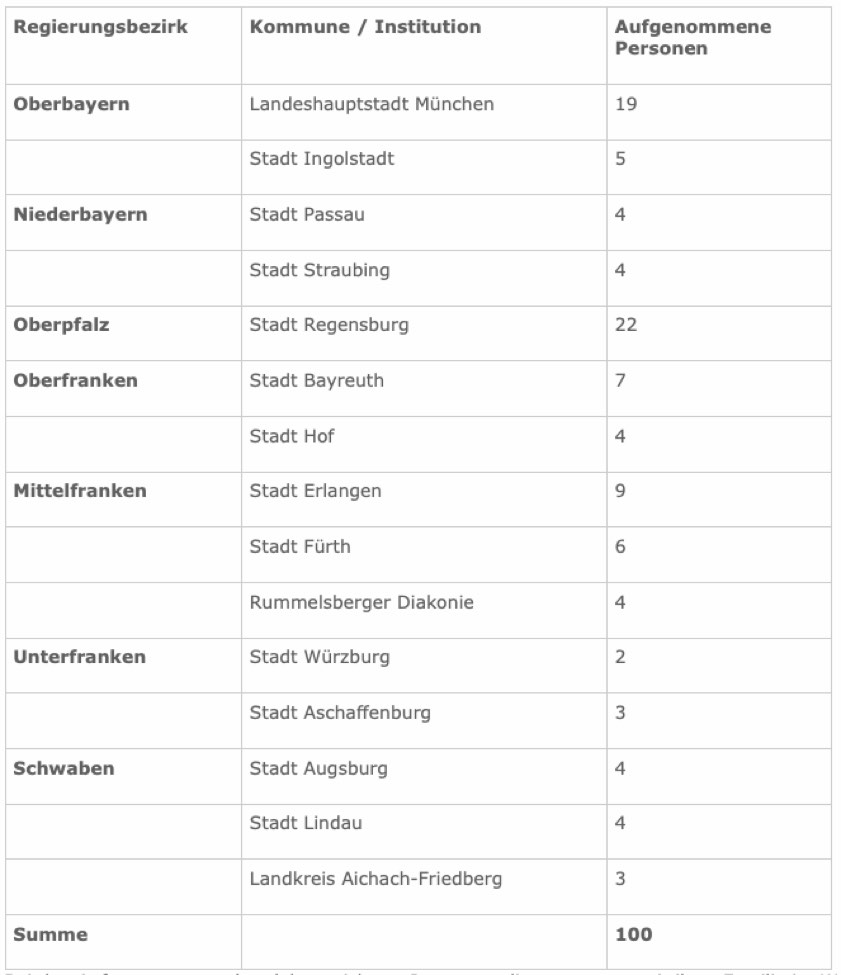 Bei den Aufgenommenen handelt es sich den Angaben zufolge um Personen, die zusammen mit ihrer Familie im Wege einer humanitären Aufnahme in die Bundesrepublik Deutschland einreisten und in der Folge eine Aufenthalts-Erlaubnis erhalten. Auch bei weiteren Aufnahme-Entscheidungen des Bundes unterstütze der Freistaat: So habe Bayern bereits 42 schwerkranke Kinder mit ihren engsten Familien-Angehörigen und sechs unbegleitete minderjährige Ausländer von den griechischen Inseln aufgenommen. Diese Personen durchlaufen laut Innenministerium nun in Bayern ihr Asyl-Verfahren. (Tabelle: Bayerisches Innenministerium)