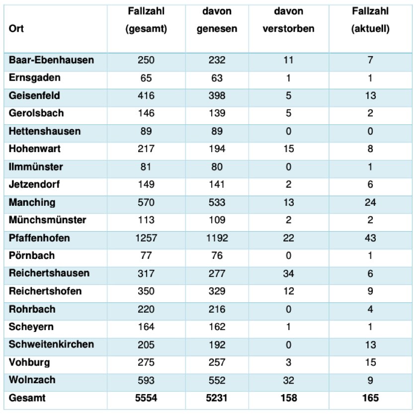(ty) In Zusammenhang mit der Corona-Pandemie gibt es im Kreis Pfaffenhofen ein weiteres Menschenleben zu beklagen. Wie das Landratsamt heute mitteilte, ist eine mit dem Virus infizierte Person im Alter von über 80 Jahren aus der Gemeinde Manching gestorben. Damit erhöht sich die Zahl der mit Corona infizierten Landkreis-Bürger, die gestorben sind, auf nunmehr 158. Das Landratsamt veröffentlicht eine tägliche Übersicht dazu (Tabelle siehe unten), in welchen Gemeinden die mit dem Virus infizierten Menschen, die gestorben sind, gelebt haben beziehungsweise wie viele bestätigte Infektionsfälle und genesene Patienten es in welcher Kommune gibt. Die Zahl der Landkreis-Bürger, die positiv auf den neuartigen Erreger getestet worden sind, hat sich seit der Meldung von gestern um 15 erhöht und beträgt somit 5554. Die Corona-Notbremse wurde im Landkreis ab 18. Mai aufgehoben, nun greifen massive Lockerungen in verschiedenen Bereichen. Außerdem gelten ab 19. Mai weitere Öffnungen, etwa für Außen-Gastro und Kinos. Zusätzliche Erleichterungen ab 21. Mai betreffen Freibäder, Fitness-Studios und Veranstaltungen.