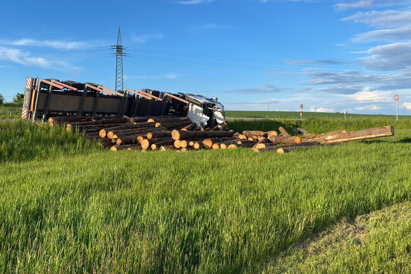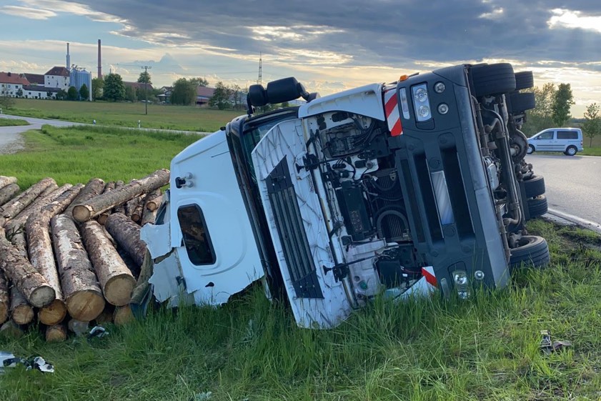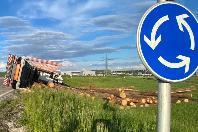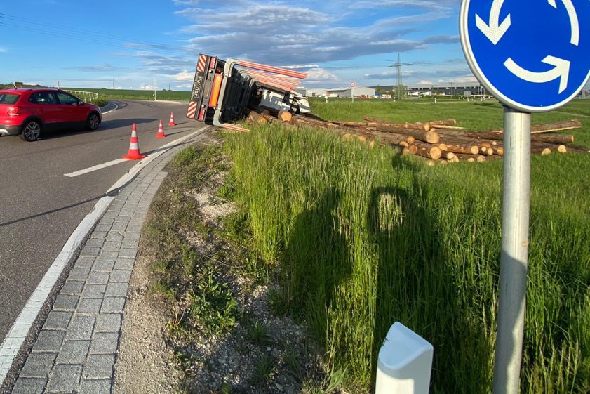 (ty) Ein spektakulärer Verkehrsunfall hat sich am frühen gestrigen Abend im Gemeinde-Bereich von Kösching ereignet. Ein 33-Jähriger, der in Richtung "Interpark" unterwegs war, geriet laut Polizei mit seinem Lastwagen in der Nähe von Desching beim Ausfahren aus dem Kreisverkehr nach rechts in das Kiesbett und das Unheil nahm seinen Lauf. Letztlich kippte der Sattelzug nach rechts um und landete im Grünbereich neben der Straße. Die Ladung des Lkw, zahlreiche mächtige Holz-Stämme, rollten in eine Wiese.