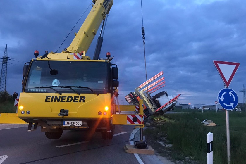 Der 33-jährige Lkw-Fahrer überstand den Unfall bei Kösching mit leichten Verletzungen. Zur Bergung musste ein Kran anrücken.