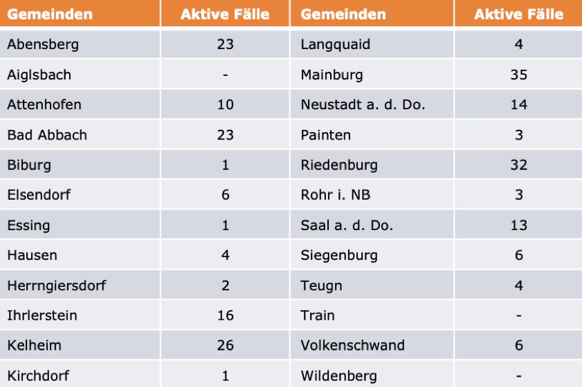 (ty) Im Kreis Kelheim gibt es in Zusammenhang mit der Corona-Pandemie, wie berichtet, mittlerweile 106 Menschenleben zu beklagen. Die weitere Situation stellt sich wie folgt dar: Unter Verweis auf Daten des Gesundheitsamts teilte das Landratsamt heute mit, dass – Stand gestern, 16 Uhr – die Zahl der im Kreis Kelheim positiv auf den neuartigen Erreger getesteten Menschen bei insgesamt 5950 liegt – das sind 16 mehr als gestern gemeldet. Insgesamt 5611 hiesige Corona-Patienten (gestern: 5592) wurden wieder aus der Quarantäne entlassen und gelten als genesen. Derzeit gebe es 233 aktive Corona-Fälle im Landkreis (gestern: 236). Zahlen aus den einzelnen Gemeinden zeigt die Tabelle unten.
