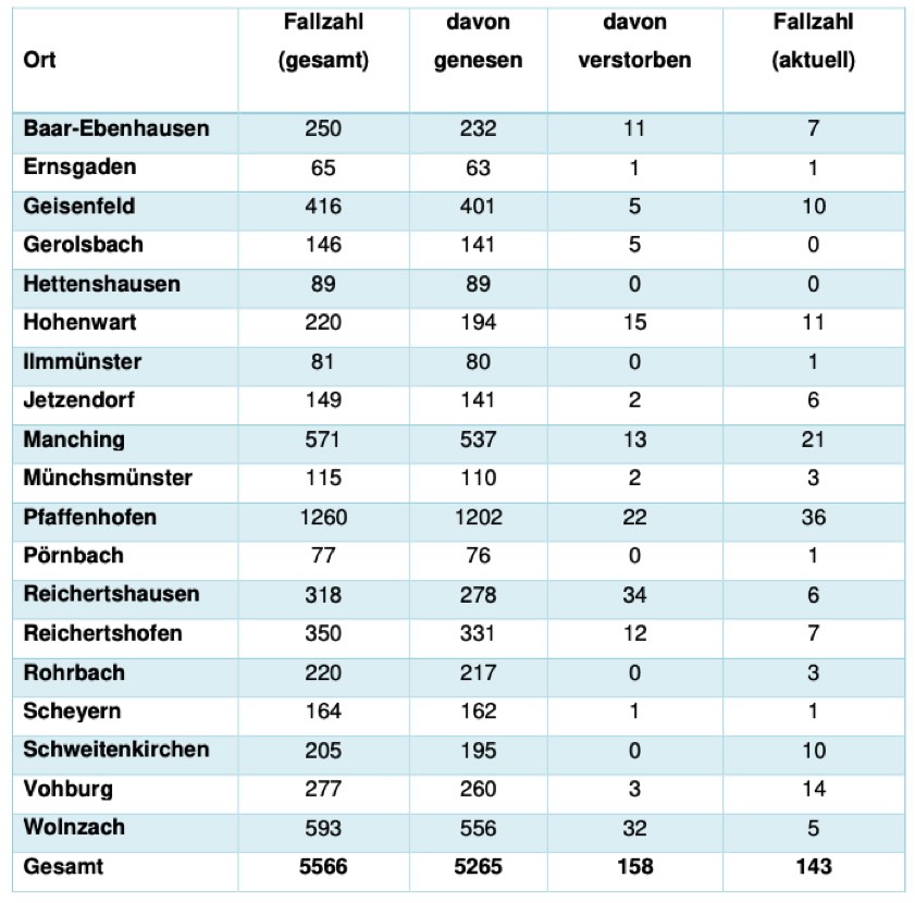 (ty) In Zusammenhang mit der Corona-Pandemie gibt es im Kreis Pfaffenhofen, wie berichtet, mittlerweile 158 Menschenleben zu beklagen. Das Landratsamt veröffentlicht eine tägliche Übersicht dazu (Tabelle siehe unten), in welchen Gemeinden die mit dem Virus infizierten Menschen, die gestorben sind, gelebt haben beziehungsweise wie viele bestätigte Infektionsfälle und genesene Patienten es in welcher Kommune gibt. Die Zahl der Landkreis-Bürger, die positiv auf den neuartigen Erreger getestet worden sind, hat sich seit der Meldung von gestern um zwölf erhöht und beträgt somit 5566. Die Corona-Notbremse wurde im Landkreis ab 18. Mai aufgehoben, nun greifen massive Lockerungen in verschiedenen Bereichen. Außerdem gelten seit 19. Mai weitere Öffnungen, etwa für Außen-Gastro und Kinos. Zusätzliche Erleichterungen ab 21. Mai betreffen Freibäder, Fitness-Studios und Veranstaltungen.
